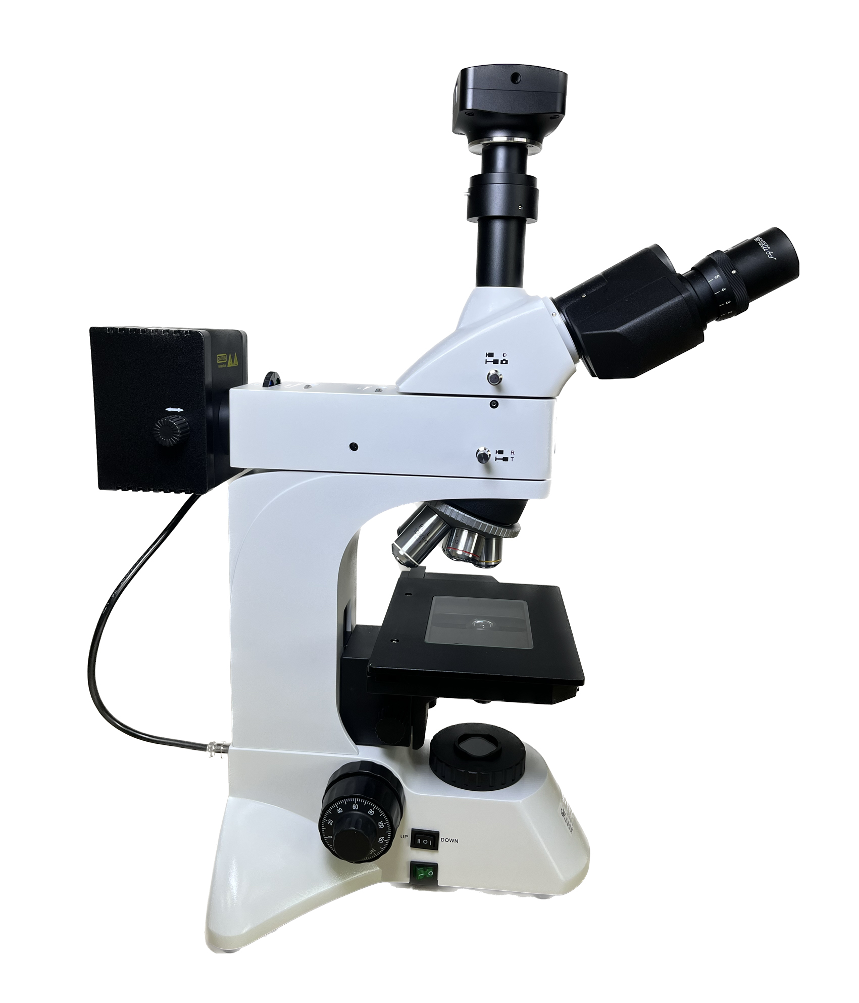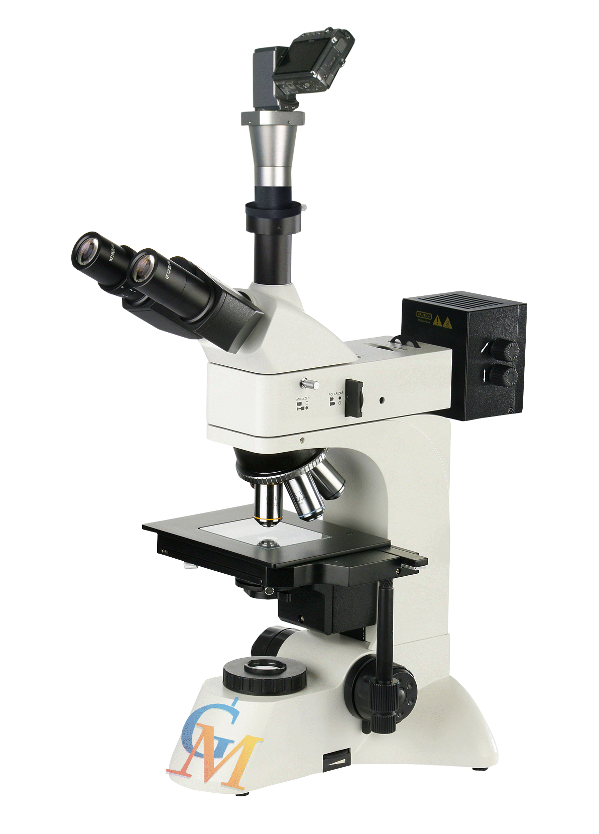 - 三目鏡筒,可自由切換正常觀察與偏光觀察,可進行100%透光攝影。